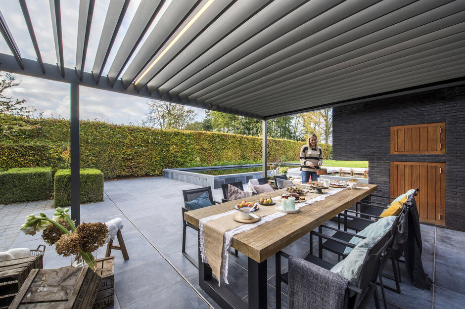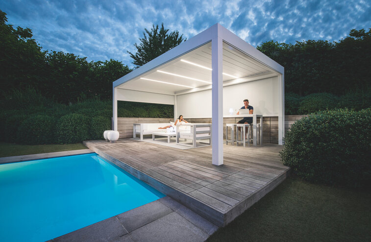 Bioklimatická pergola je zahradní přístřešek vyrobený z extrudovaného hliníku a vybavený střechou z lamel. Lamely, které lze libovolně otáčet, chrání terasu před slunečními paprsky, deště, ale i sněhem. Hlavní předností hliníkových lamel je zajištění přirozeného proudění vzduchu okolo lamel, které ochlazuje prostor pod pergolou a vytváří tak příjemné klima i ve velkém horku. Naše pergoly se dokonale přizpůsobí rozměrům vaší terasy a vašim požadavkům na případné komfortní doplňky.